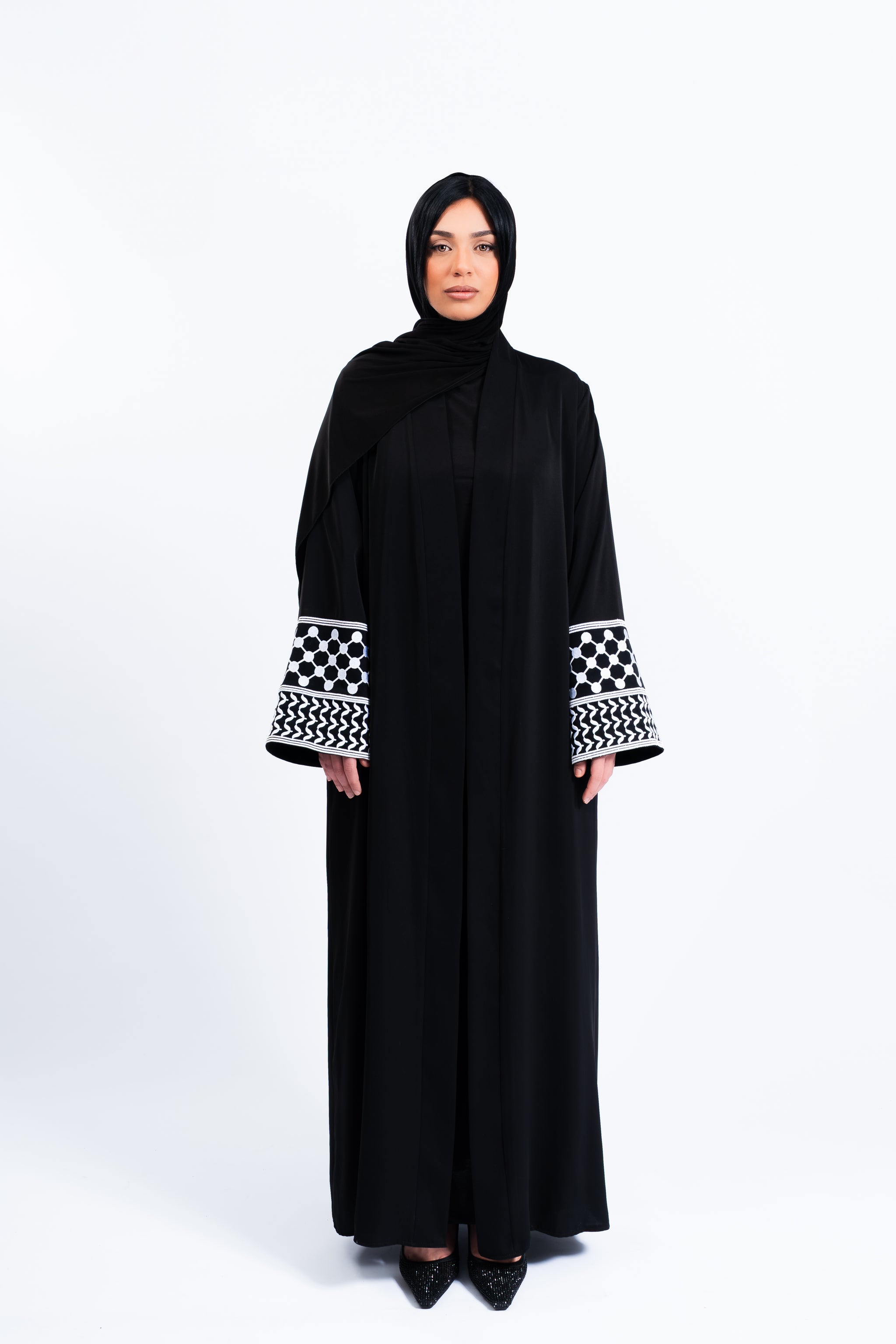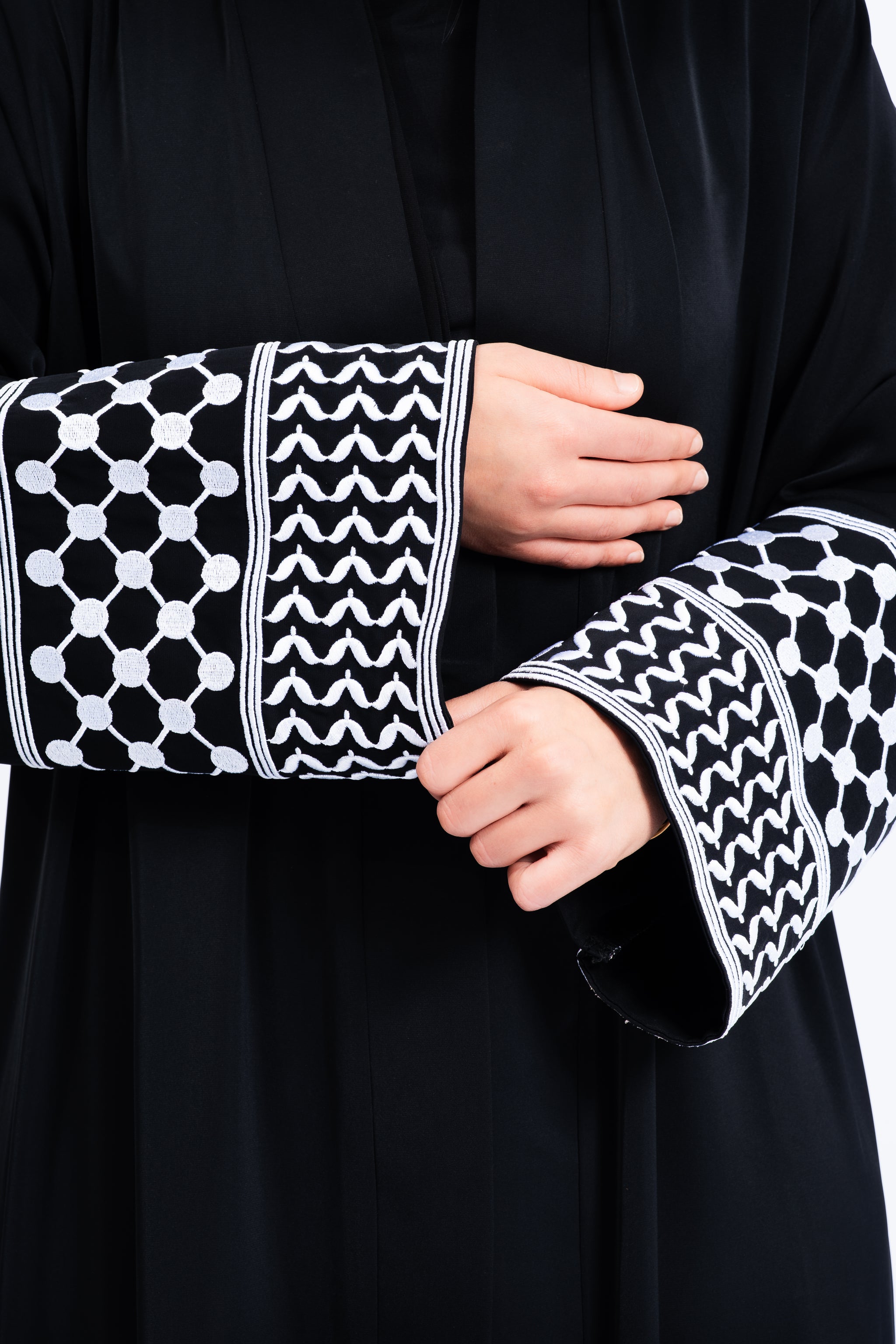 Abaya fluide, larges poignets brodés inspirés du Keffieh palestinien.